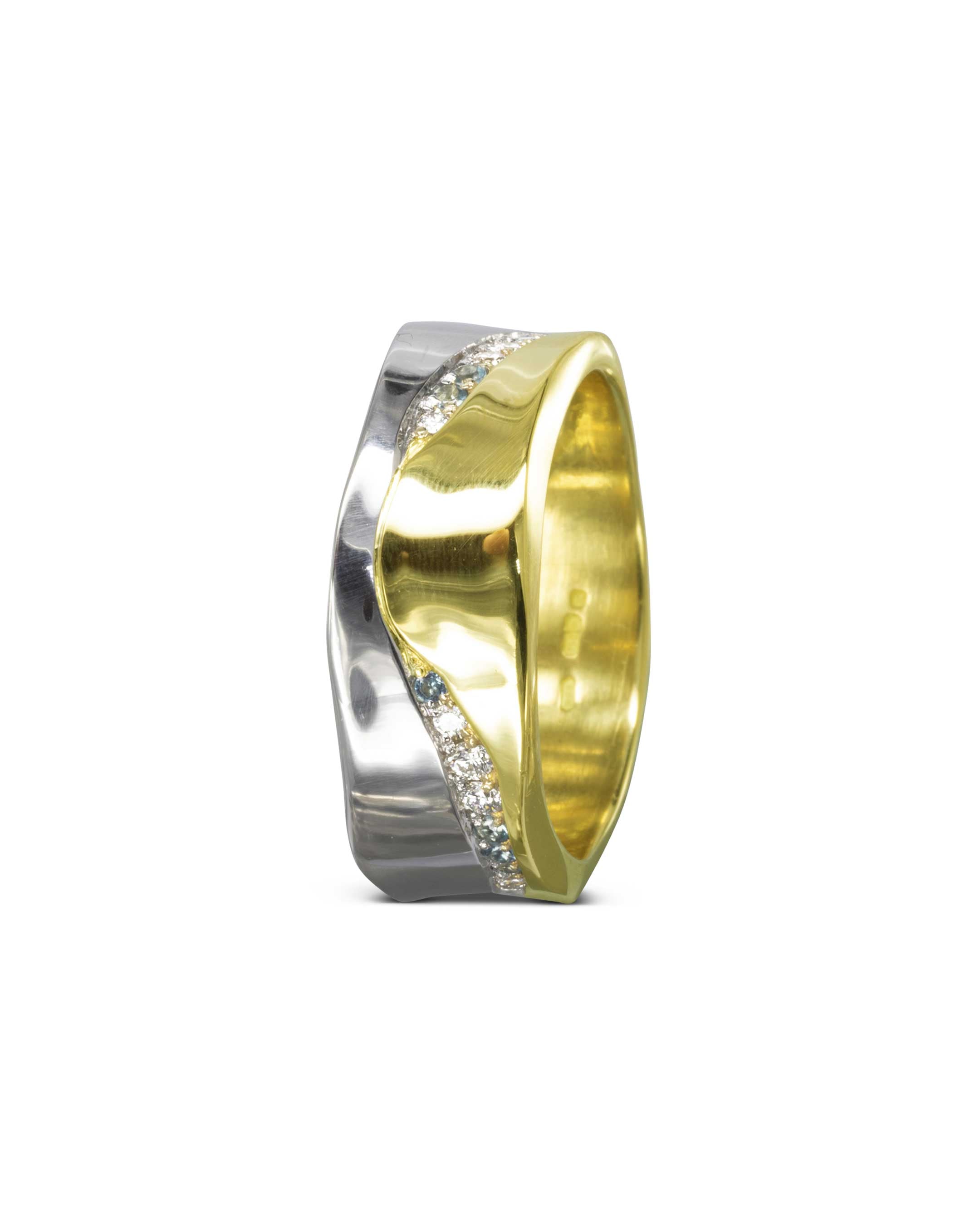 • Pavé Setting: Tiny round brilliant cut diamonds and sapphires are pavé-set along the irregular join of the two mixed metals, ensuring a seamless and continuous sparkle around the entire eternity ring. Please note that the model is pictured wearing a ring of the same width without the sapphires, showcasing the versatility of this design.