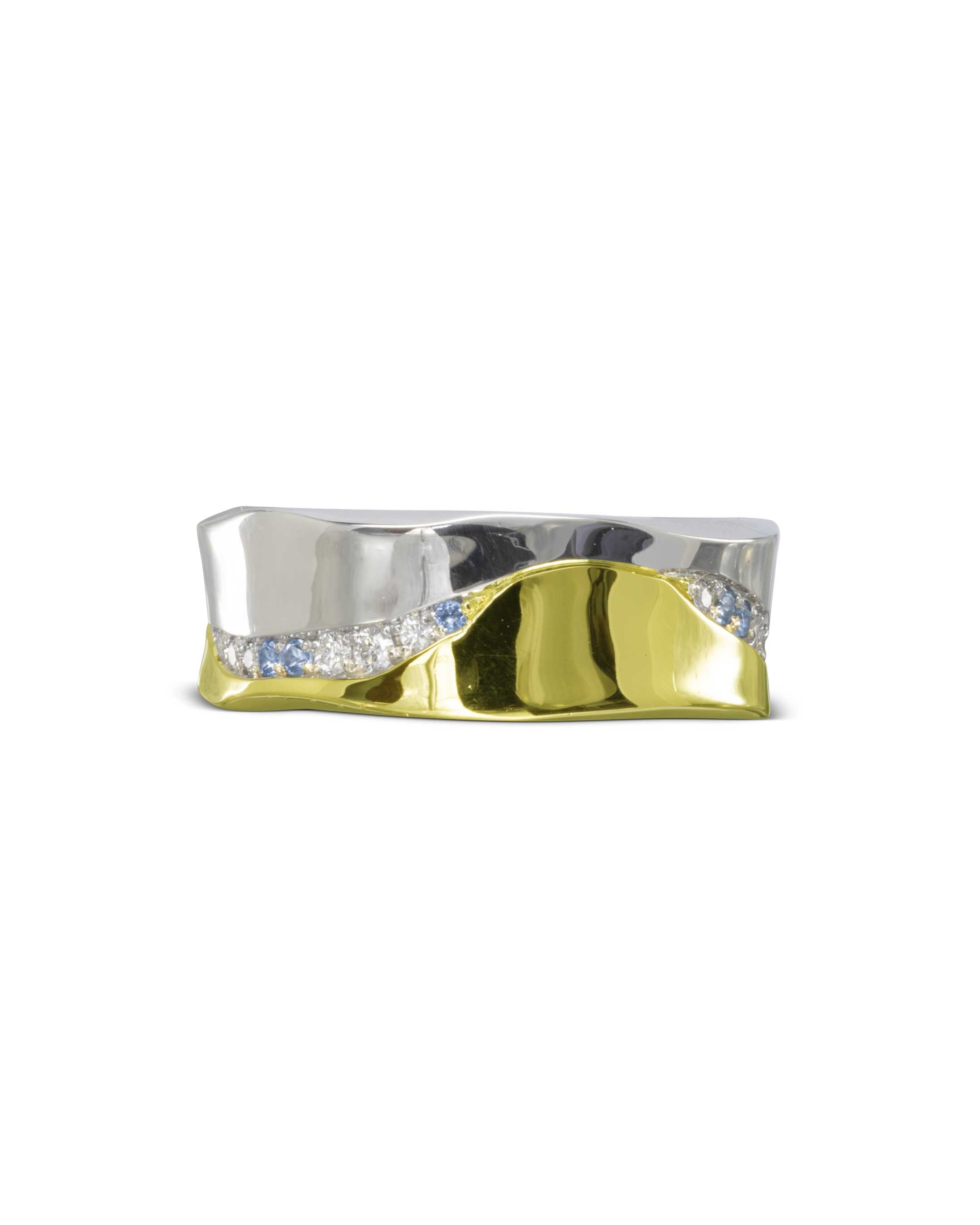 • Diamonds and Sapphires: The ring is handmade from approximately 15g of 18ct yellow gold and platinum and set with round brilliant cut diamonds and sapphires ranging from pale blue to dark blue in an undulating line.